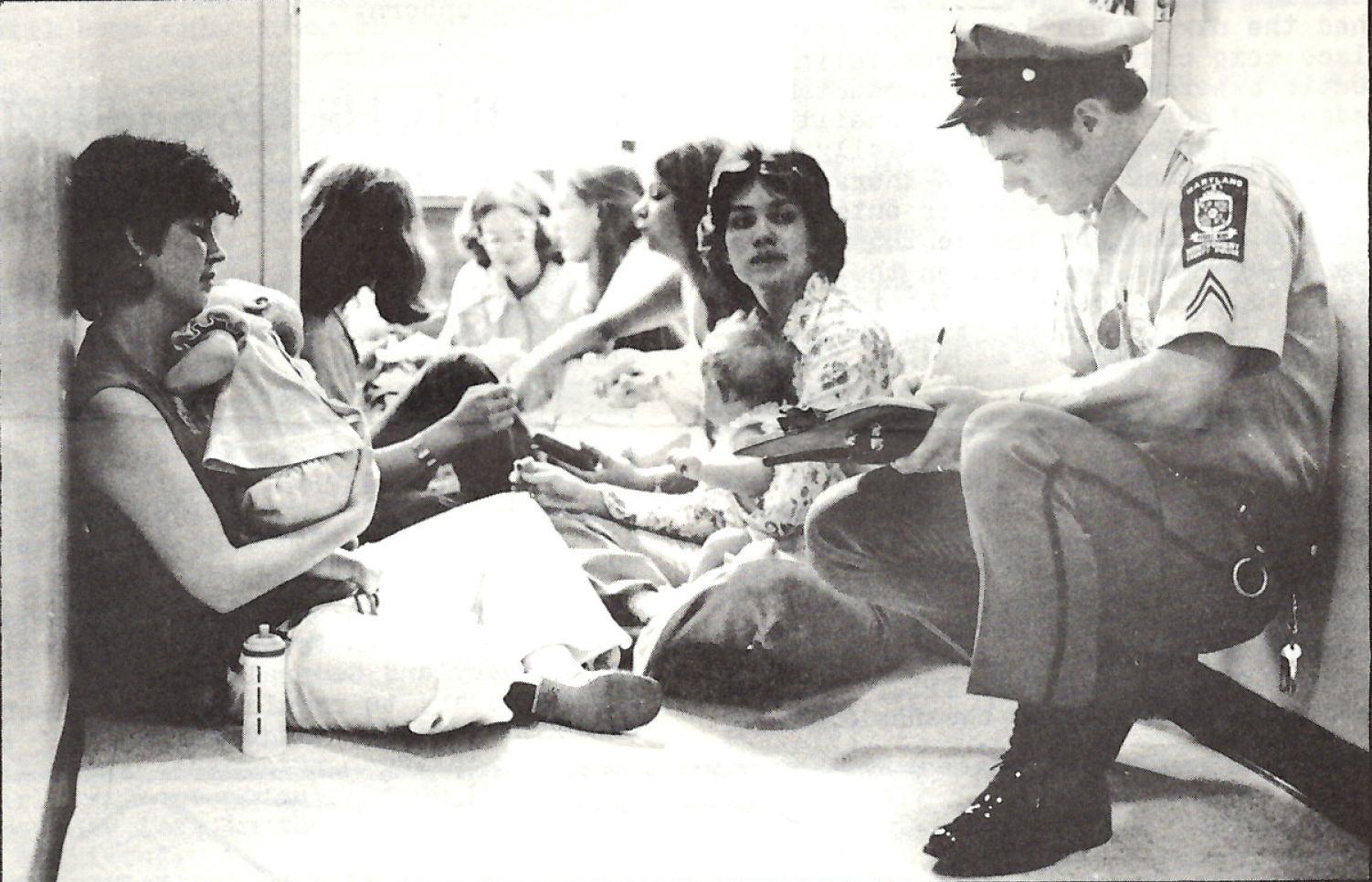 It was then that the remaining women decided to escalate. They moved from the waiting room to the narrow hallway in front of the suite and linked arms, blocking the entrance entirely. They tried to speak to any patron who attempted to breach their blockade. Around noon, fed up, Naugle announced she would prosecute the eight ladies, enabling the police to begin their protocols for arrests. At 12:35 Naugle declared the ladies to be trespassing. At 12:45 Meicklejohn then advised the ladies that they would be prosecuted if they did not leave the premises, and a young lady who refused to give her name to the officer got up and left. Based on pictures of the women in the hallway, we believe this young lady was Jeanne Miller, a minor. The remaining ladies stated that they refused to leave and would have to be carried out as they would not move. These ladies were identified as Chris Mooney, Ann Schutt, Jeannette Reinecker, Eileen Renzi, Amy Donohoo, Lisa Donohoo, and Mary Hayes. They were dragged out to the police cars, with care as two held babies, and transported to Bethesda Station, where Lisa was released to her mom as she was a minor. While this meant only the six adult women were charged with trespassing (a misdemeanor), they agreed in solidarity to call themselves “The Sigma Seven”. (While many sources have referred to them as “The Sigma Six”, all four demonstration participants interviewed insisted adamantly that they were “The Sigma Seven”, and they are named this way in the AHL article as well.)